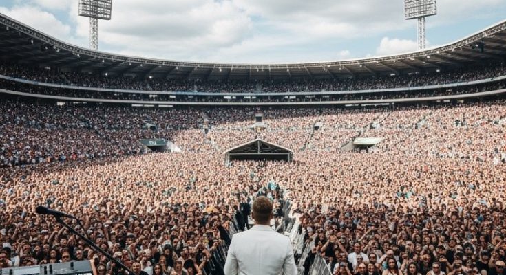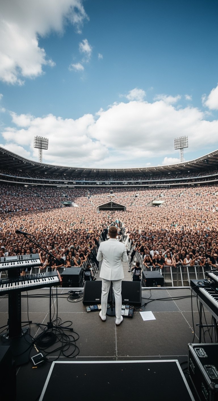 Dressed simply in a white tank top, jeans, and a single armband, the performer walked onto the stage with nothing but a microphone stand and unshakable confidence. From the very first note, the stadium came alive. It wasn’t just about the music — it was about presence, command, and the rare ability to connect with every person in the crowd.