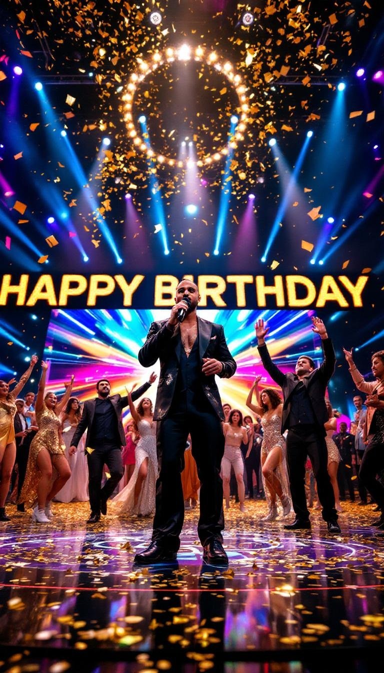 As the lights flashed and the crowd roared, golden confetti rained down, turning the entire room into a giant birthday bash. The massive LED screens lit up with colorful visuals, while dancers, acrobats, and musicians joined in to create a truly unforgettable spectacle.