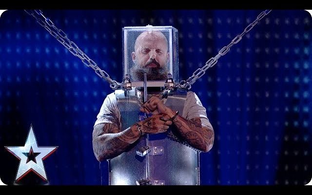 Matt began by locking himself inside a solid steel and glass tank, filled completely with water. His hands were chained, his neck padlocked, and the only way out was through a complex escape mechanism that required perfect timing. As the water rose above his head, tension filled the theater — every second counted.